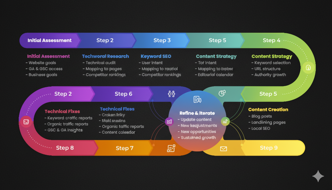 Our SEO process is designed to deliver real, measurable results. From deep market research to smart strategy, precise execution, and continuous tracking, we ensure your website ranks higher, drives targeted traffic, and achieves long-term online growth.